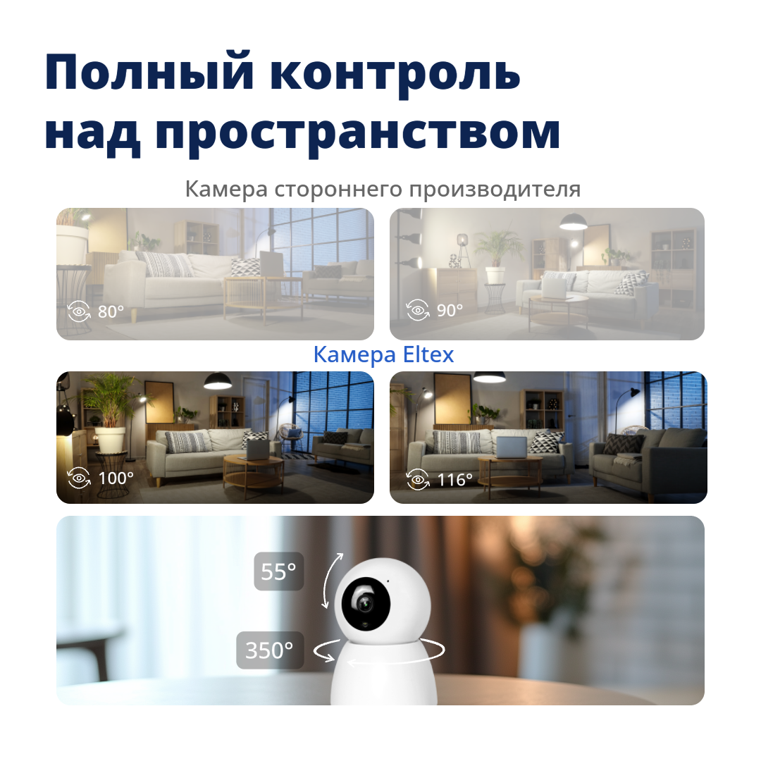 Управляйте камерой в приложении Eltex Home: наклоняйте и поворачивайте как нужно, просматривайте нужные эпизоды — видеозаписи сохраняются в архив на карту памяти или в облако.