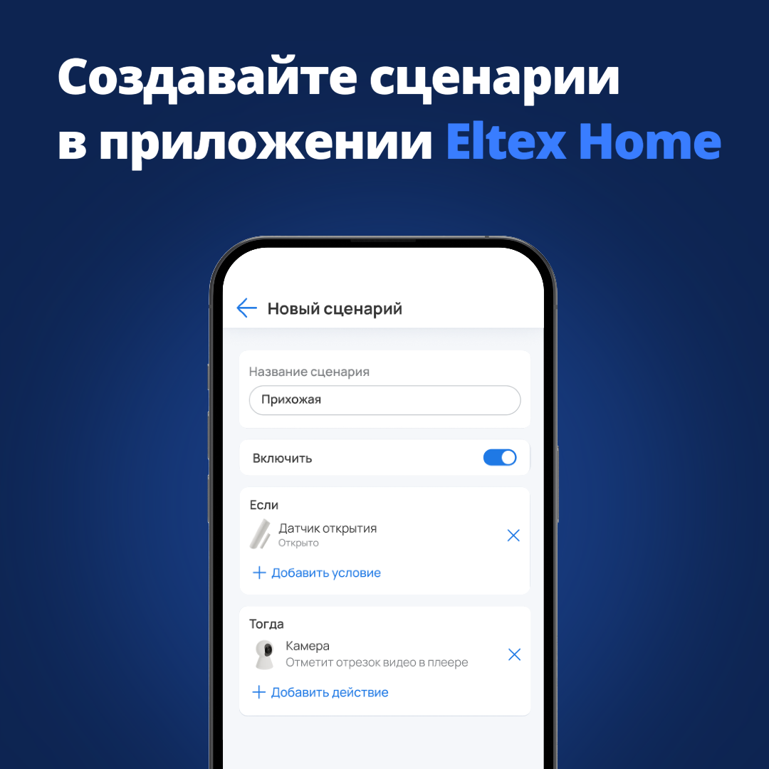 Используйте камеру дома: проверяйте, как дела, наблюдайте за питомцами, приглядывайте за детьми, контролируйте автомобиль на парковке. Хотите больше возможностей — добавляйте другие умные устройства Eltex и создавайте автоматические сценарии. Например, запись начнётся, как только откроется дверь или сработает датчик протечки.