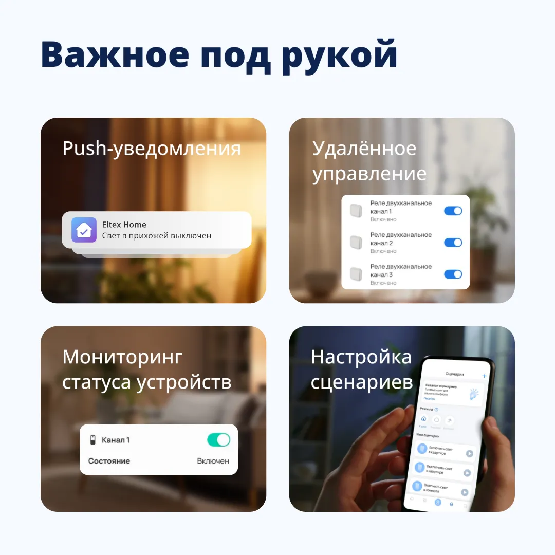 Управление доступно через приложение Eltex Home и голосом: помощники Алиса, Салют и Маруся помогут включать свет, даже если руки заняты или вы уже устроились на диване. Можно создавать сценарии с другими устройствами, чтобы освещение подстраивалось под ритм дня, встречало вас вечером и делало дом уютнее без лишних движений.