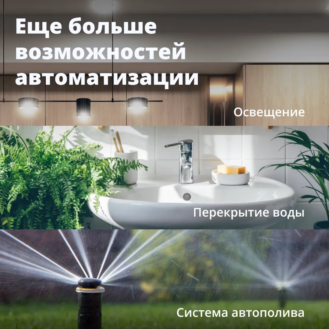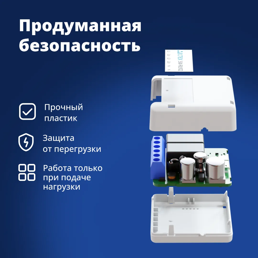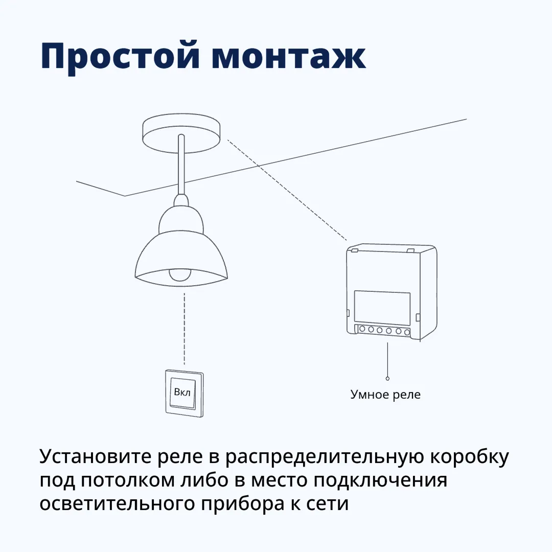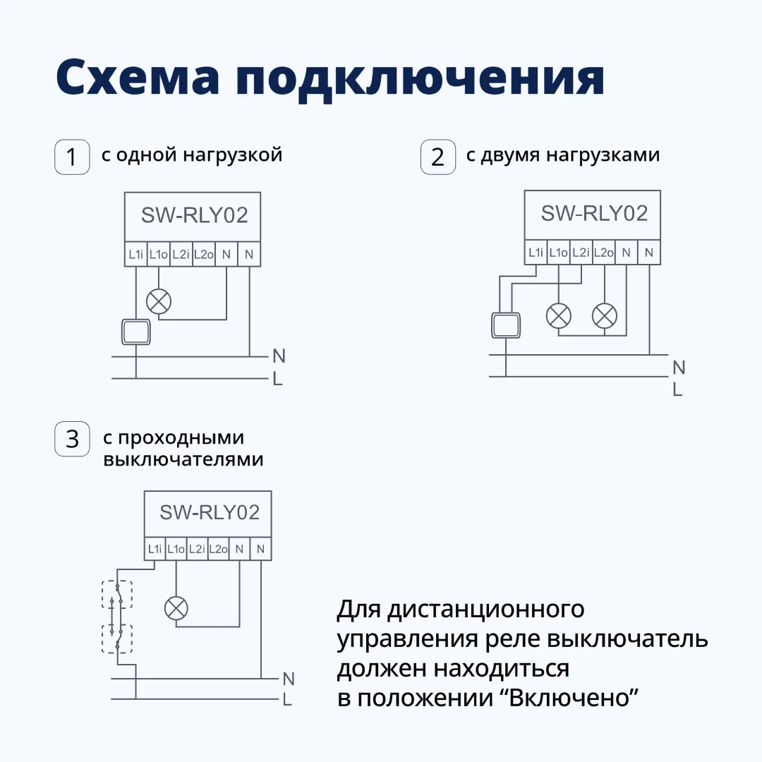 Реле поддерживает два независимых канала: до 800 Вт для резистивной нагрузки и до 100 Вт для светодиодных ламп. Поддерживаются популярные типы выключателей: клавишные, звонковые и проходные.