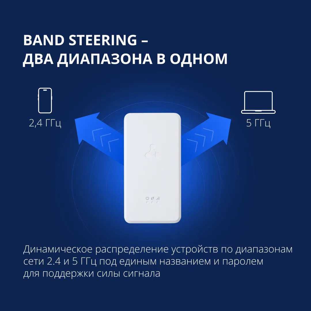 Благодаря технологии Band Steering не нужно выбирать, к сети какого диапазона подключить ваше устройство. Репитер объединяет сети 2,4 и 5 ГГц под единым названием и паролем и автоматически переподключает сеть в зависимости от силы сигнала.