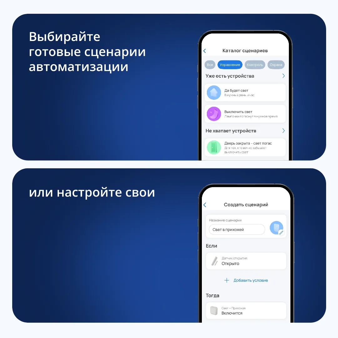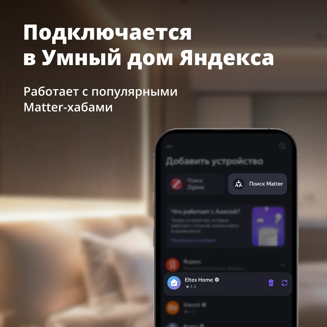 Управление доступно через приложение Eltex Home и голосом: помощники Алиса, Салют и Маруся помогут включать свет, даже если руки заняты или вы уже устроились на диване. Можно создавать сценарии с другими устройствами, чтобы освещение подстраивалось под ритм дня, встречало вас вечером и делало дом уютнее без лишних движений.