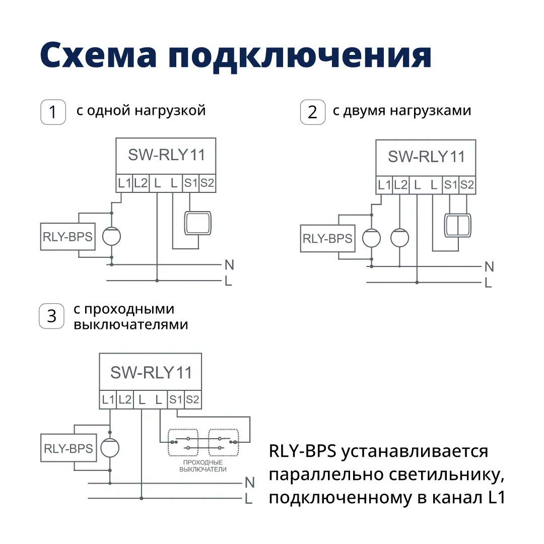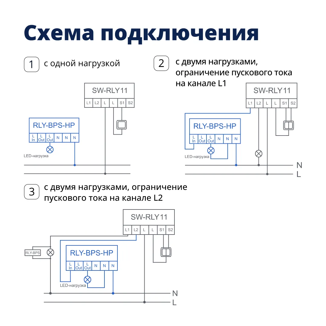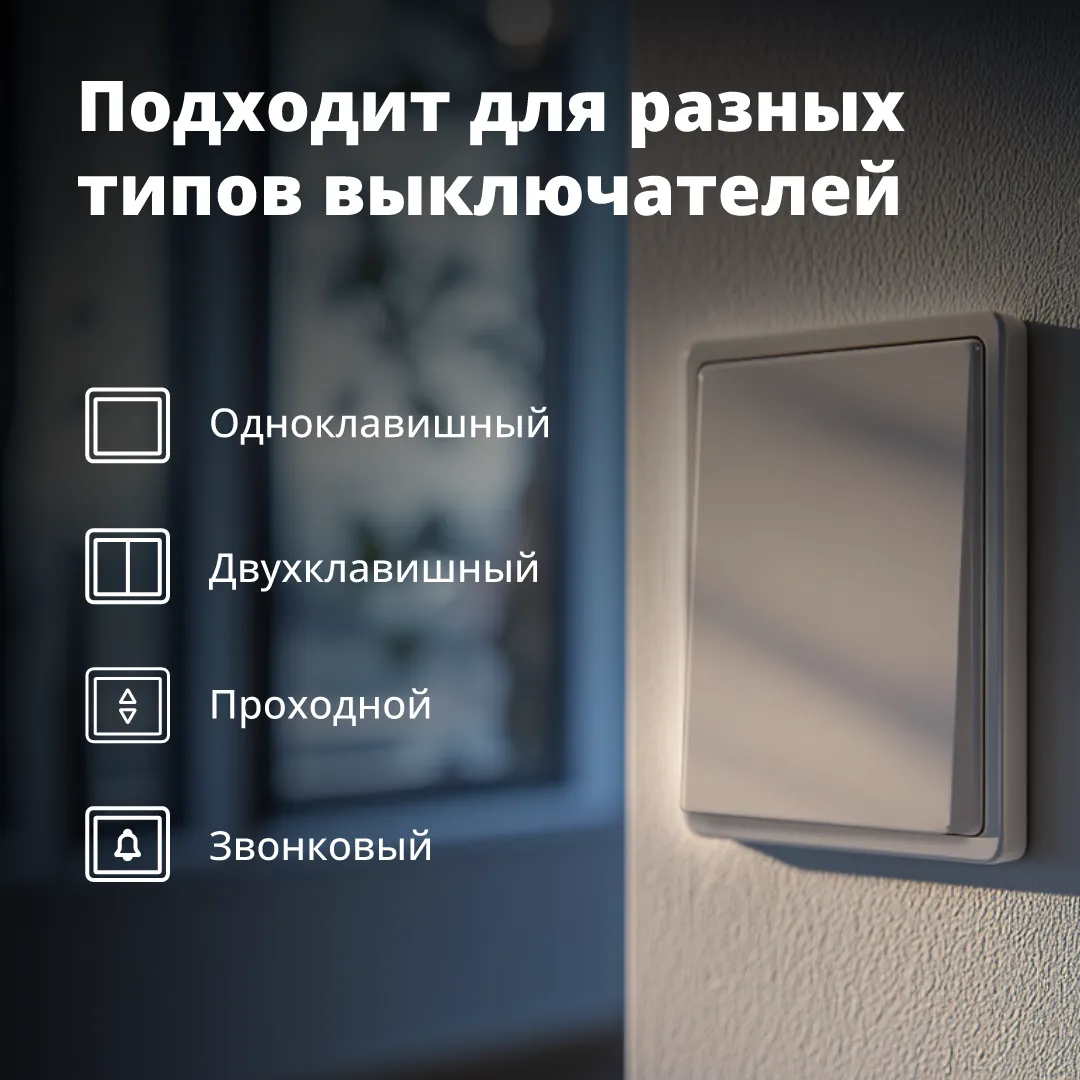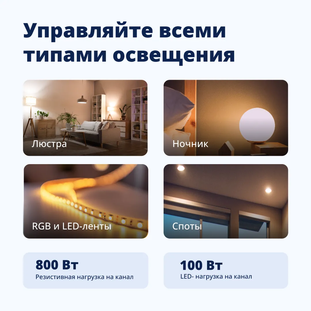 Реле поддерживает два независимых канала: до 800 Вт для резистивной нагрузки и до 100 Вт для светодиодных ламп. Это удобно, если в комнате несколько групп света или нужно разделить освещение на зоны. В комплект входит байпас, который обеспечивает корректную работу с маломощными светодиодными лампами.