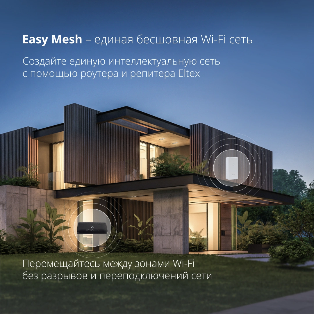 RG-1440G-WAC совместим с любыми устройствами, поддерживающими EasyMesh, и отлично работает в связке с репитерами Eltex для расширения зоны покрытия беспроводной сети.