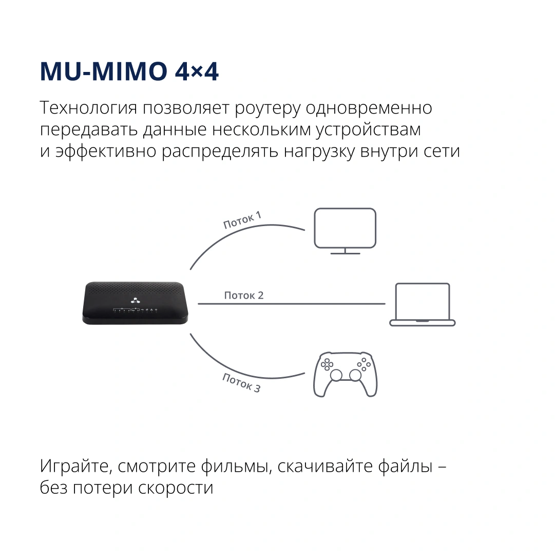 Устройство поддерживает стандарт IEEE 802.11ac Wave 2 и технологию MU-MIMO 4×4, благодаря чему несколько устройств могут одновременно смотреть видео в 4K, загружать файлы и играть онлайн без задержек и «подвисаний».