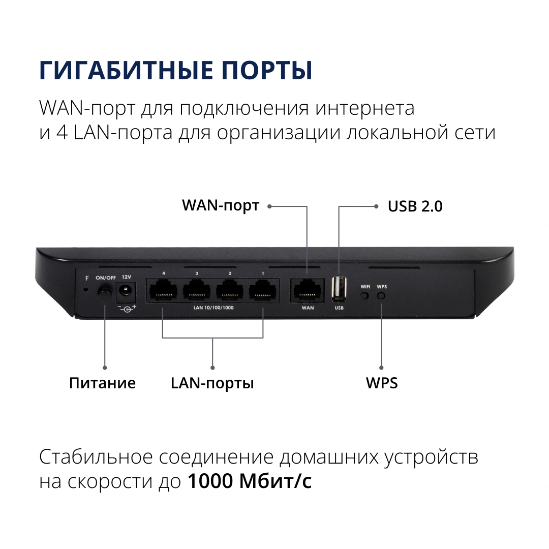 Для проводных подключений предусмотрены 4 LAN-порта, что позволяет подключать компьютеры, телевизоры и другие устройства, требующие стабильного соединения.