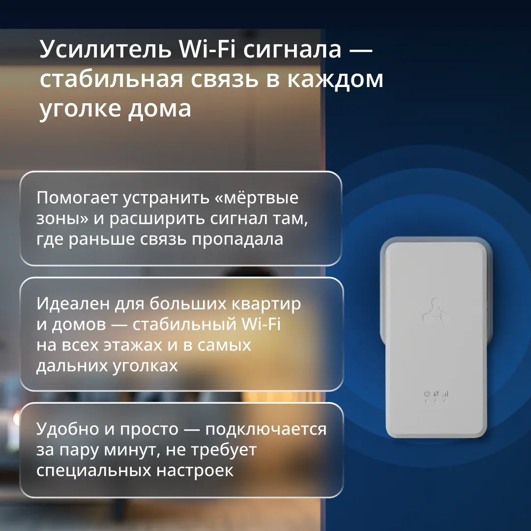А если дом большой? Просто добавьте еще несколько Wi-Fi репитеров RR-11. Благодаря технологии EasyMesh они легко и быстро объединяются в бесшовную сеть. Переход из одной зоны сети в другую будет незаметен – вам не нужно заново авторизоваться и прерывать потребление контента.