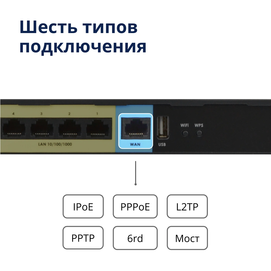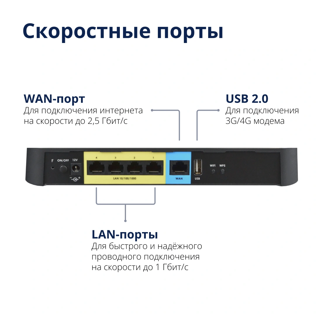 Порт WAN 2,5 Гбит/с поможет перейти на более скоростной интернет-тариф и получить максимум от домашней сети, а четыре порта LAN 1 Гбит/с – для подключения ваших устройств, которым требуется быстрый интернет по проводу.