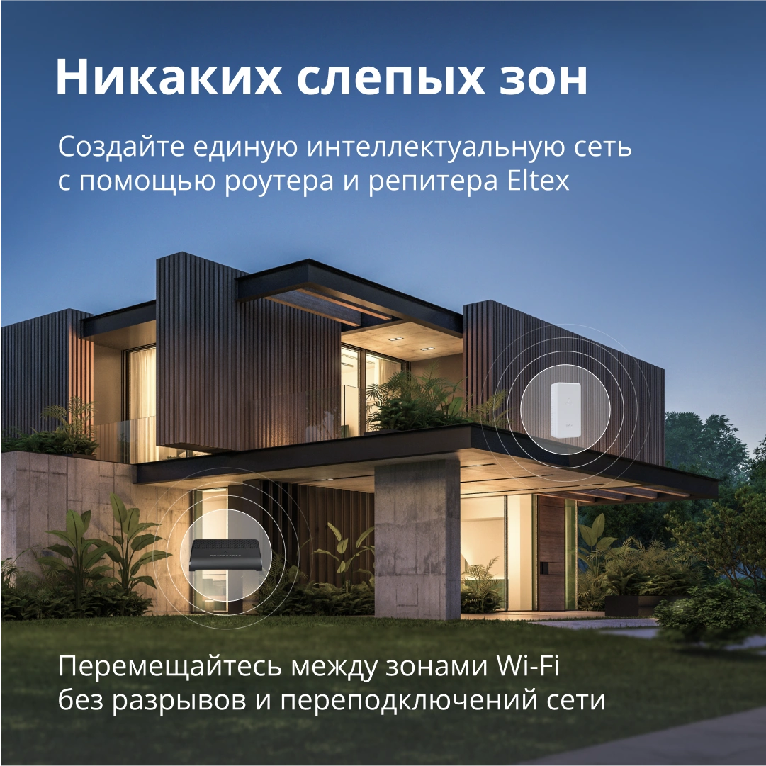 Проблему «мёртвых зон» на большой площади поможет решить технология EasyMesh. Она позволяет объединять роутеры и репитеры от Eltex для расширения сети. Создайте сеть Wi-Fi с единым логином и паролем и перемещайтесь между ее зонами в доме без разрывов соединения и переподключений к сети.