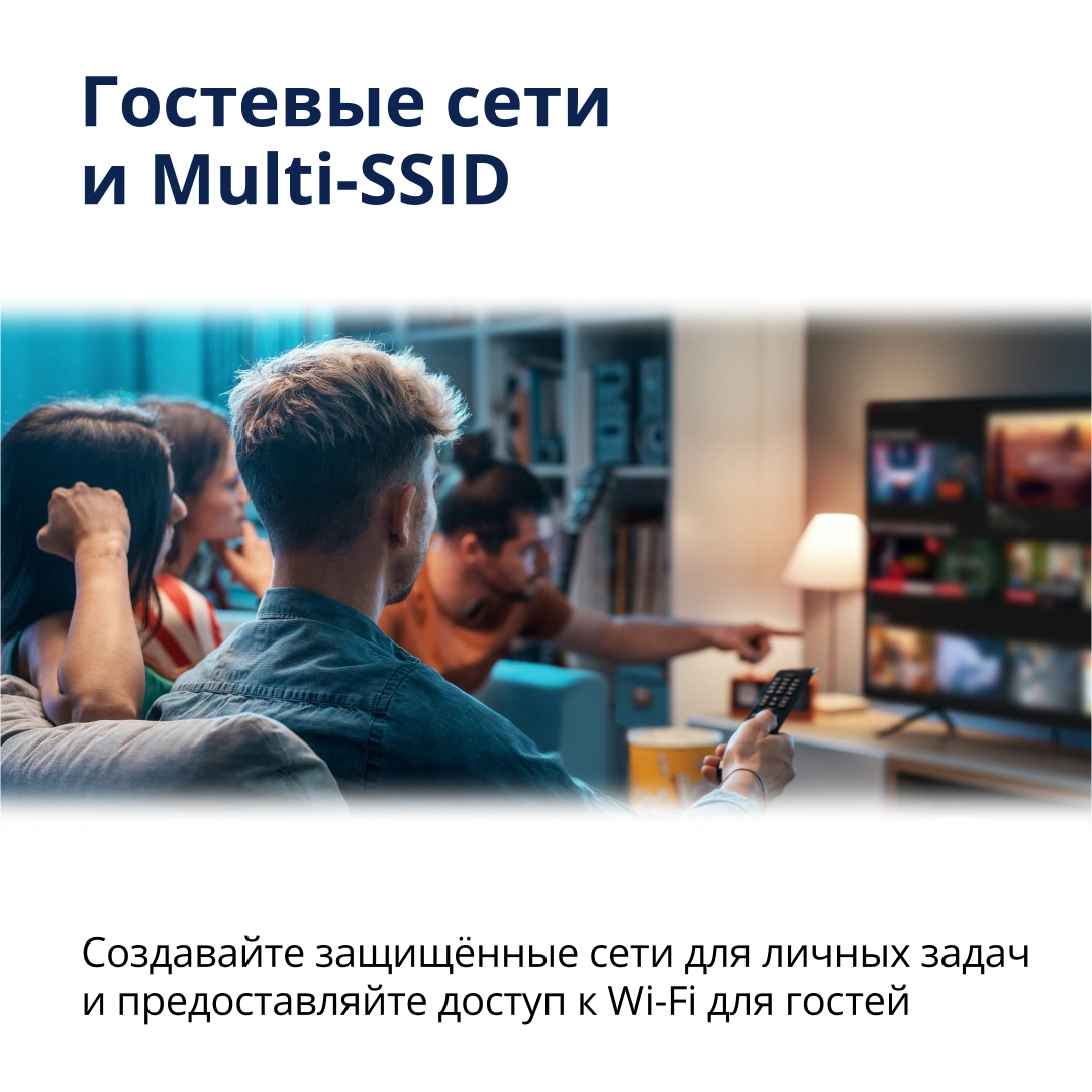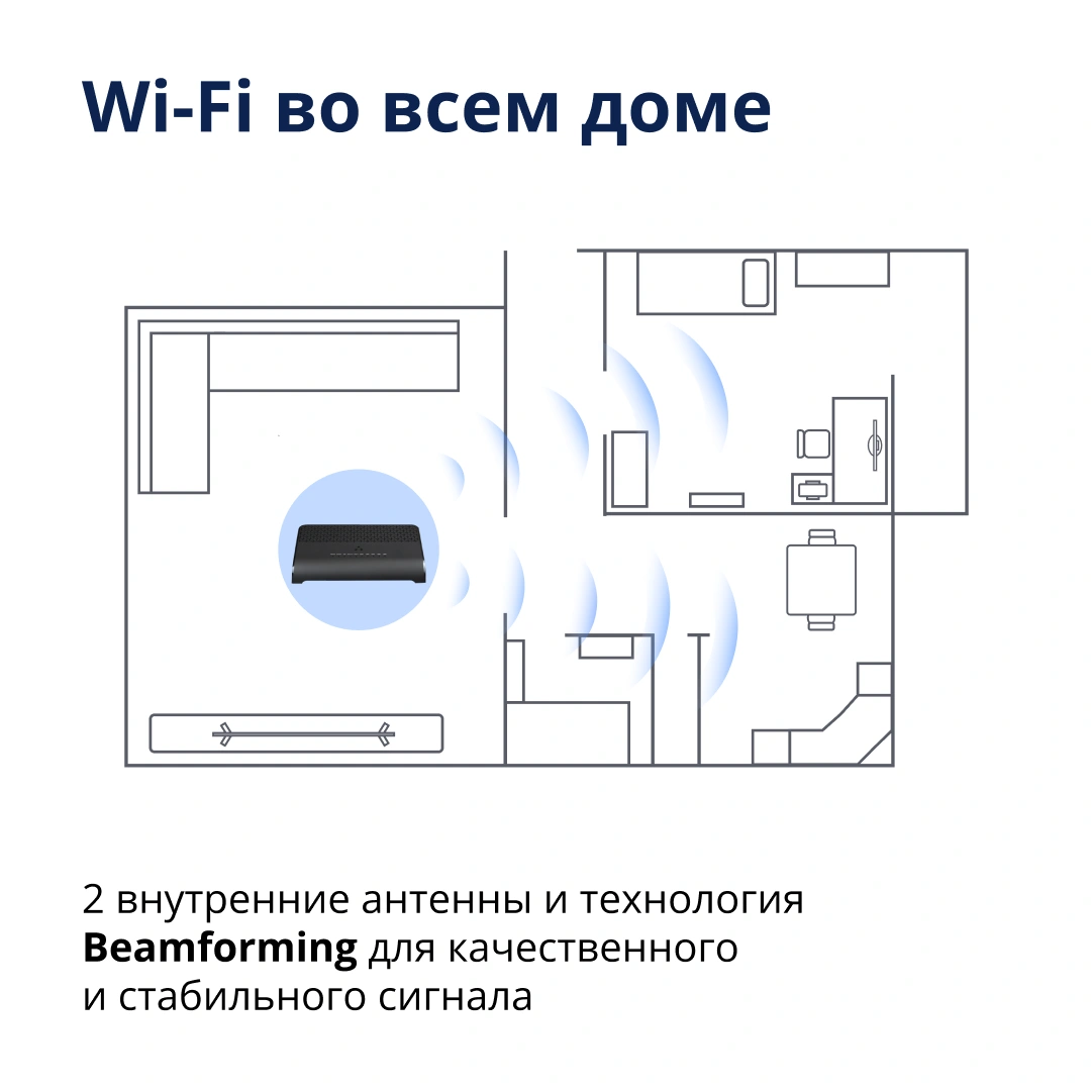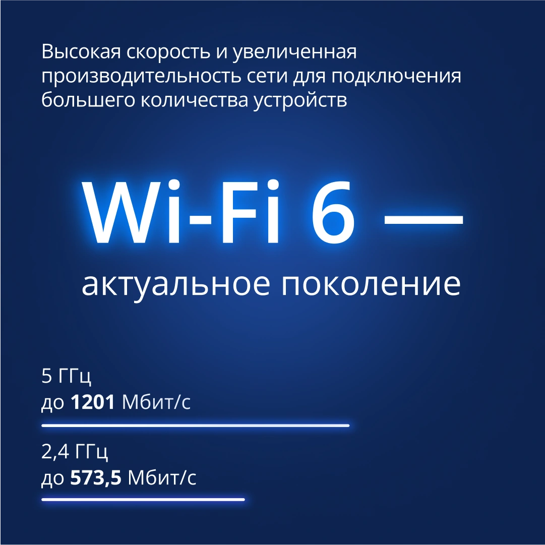 Поддерживает суммарную скорость передачи данных «по воздуху» более 1,7 Гбит/c. Работает сразу в двух диапазонах для эффективного распределения нагрузки внутри сети. Например, к сети 5 ГГц можно подключить требовательные к скорости устройства – игровую приставку или смарт-телевизор, а к сети 2,4 ГГц – устройства умного дома.