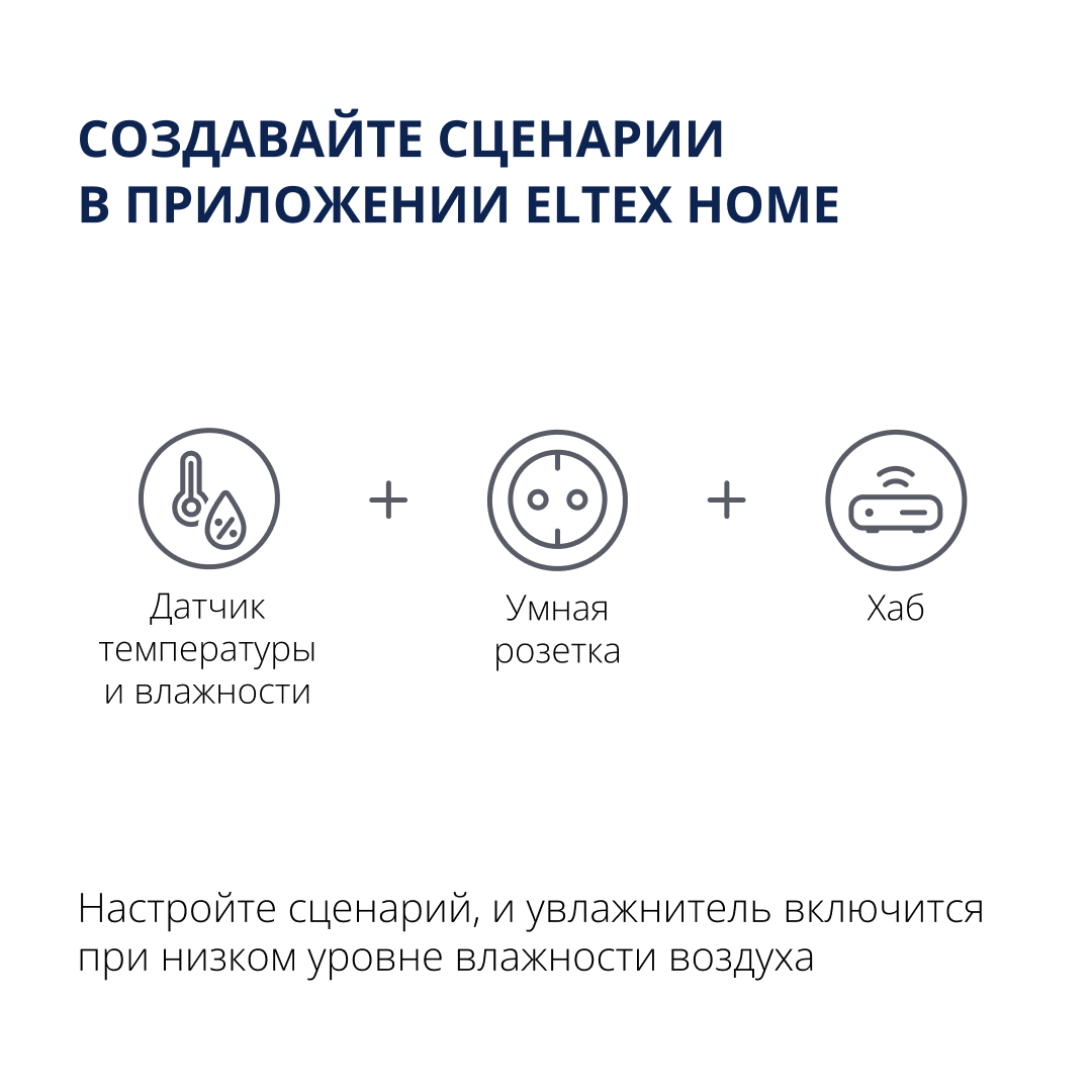 Устройство поддерживает сценарии с другими устройствами Eltex: можно автоматически включать увлажнитель при снижении влажности или запускать климатическую технику, когда в комнате становится жарко. Управление и контроль доступны в приложении Eltex Home, а также через голосовых помощников — Алису, Салют и Марусю.