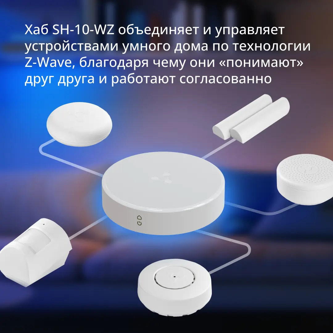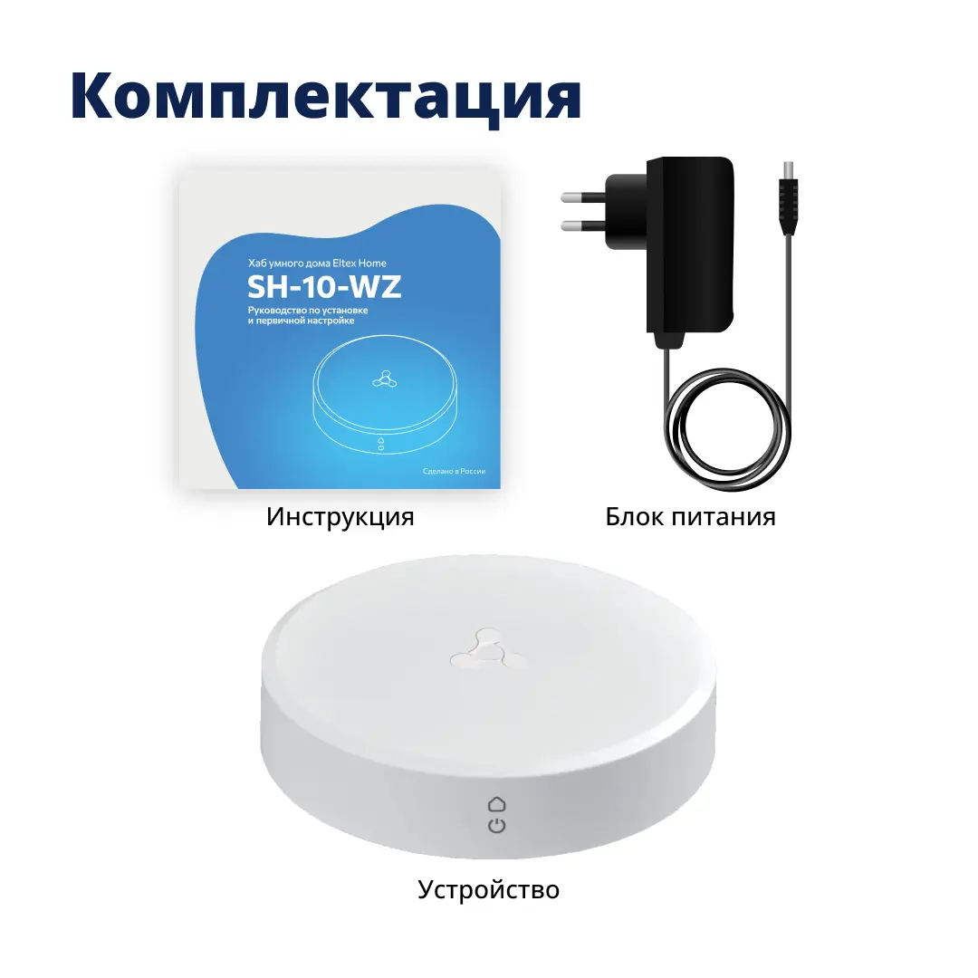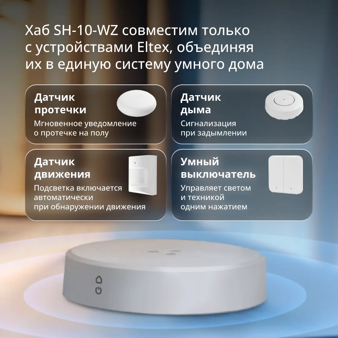 Хаб умного дома Eltex SH-10-WZ — центральное звено экосистемы Eltex для управления устройствами по протоколу Z-Wave. Он объединяет датчики и другие умные устройства в единую систему и обеспечивает их стабильную работу и взаимодействие.