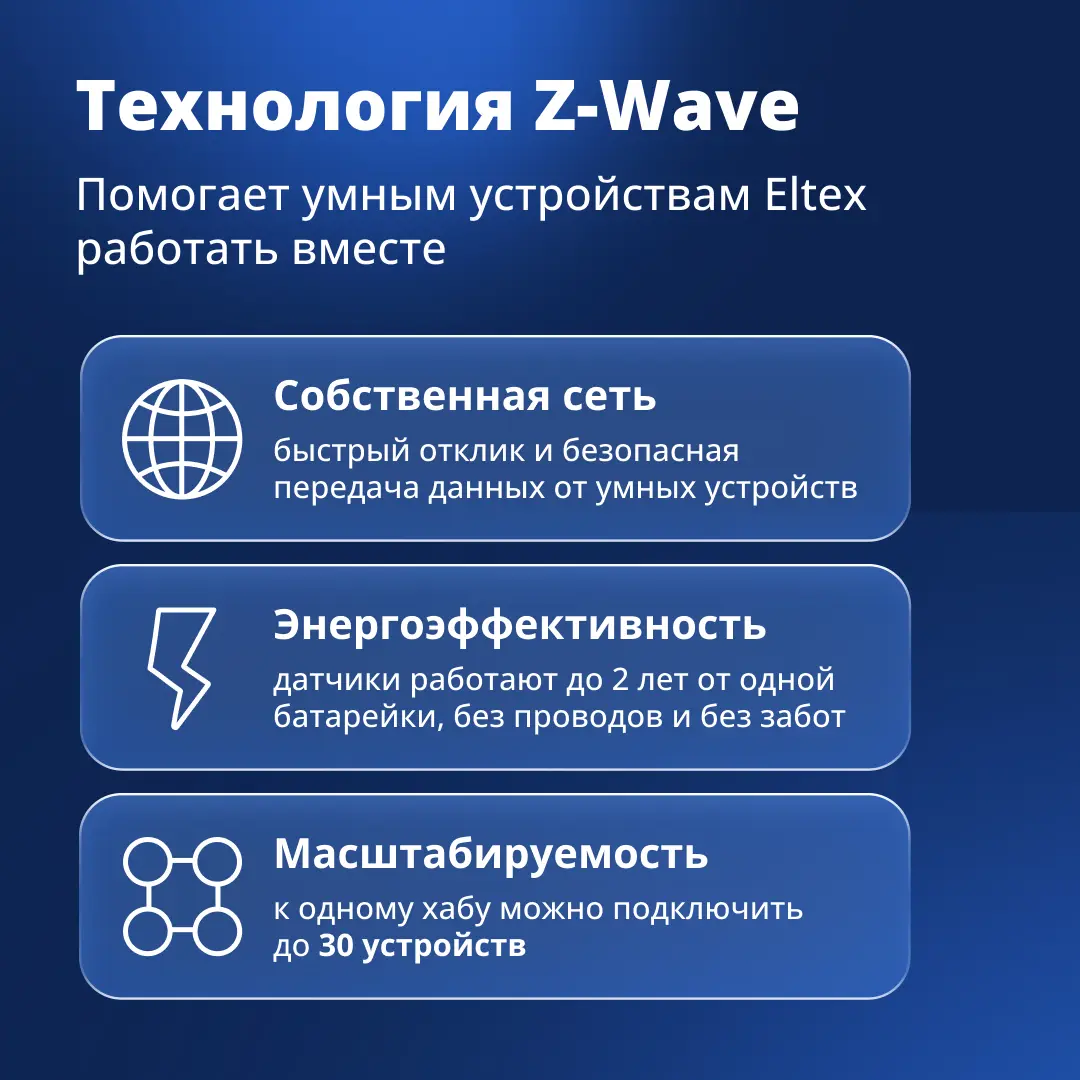 К хабу можно подключить до 30 Z-Wave-устройств Eltex. SH-10-WZ передаёт команды управления и синхронизируется с приложением Eltex Home через интернет. Это позволяет использовать датчики Z-Wave совместно с другими смарт-устройствами, включая Wi-Fi-девайсы, в общих сценариях автоматизации.