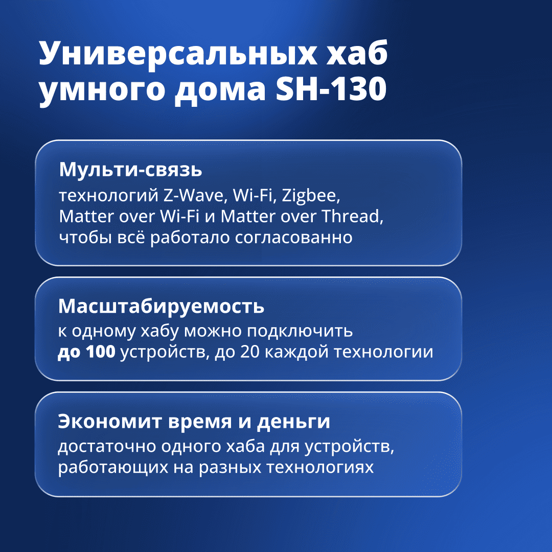 Больше устройств – больше сценариев для автоматизации. Поддерживает подключение до 20 устройств каждой технологии – Zigbee, Z-Wave, Wi-Fi MQTT, Matter over Wi-Fi и Matter over Thread, сохраняя стабильность соединения и высокую скорость отклика.