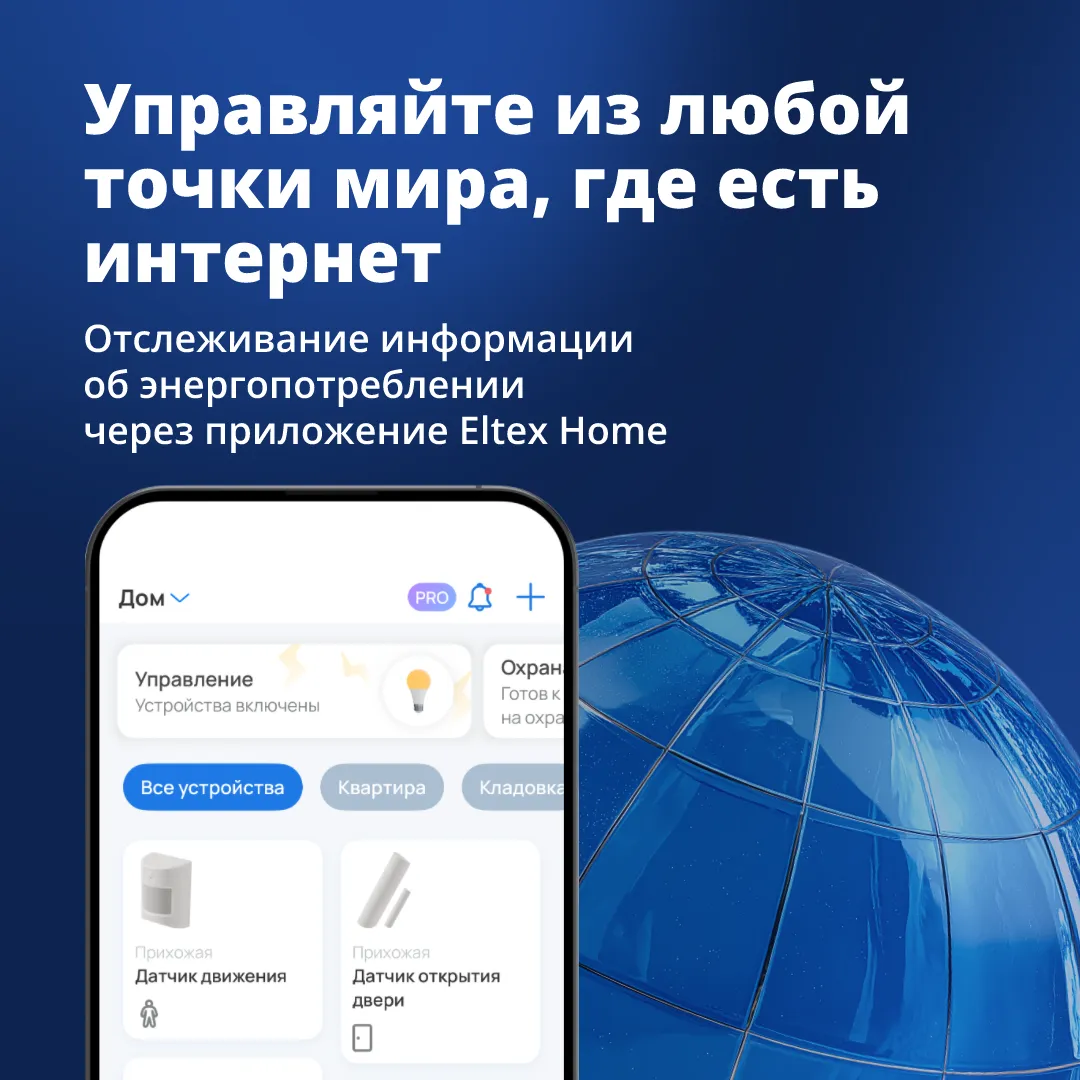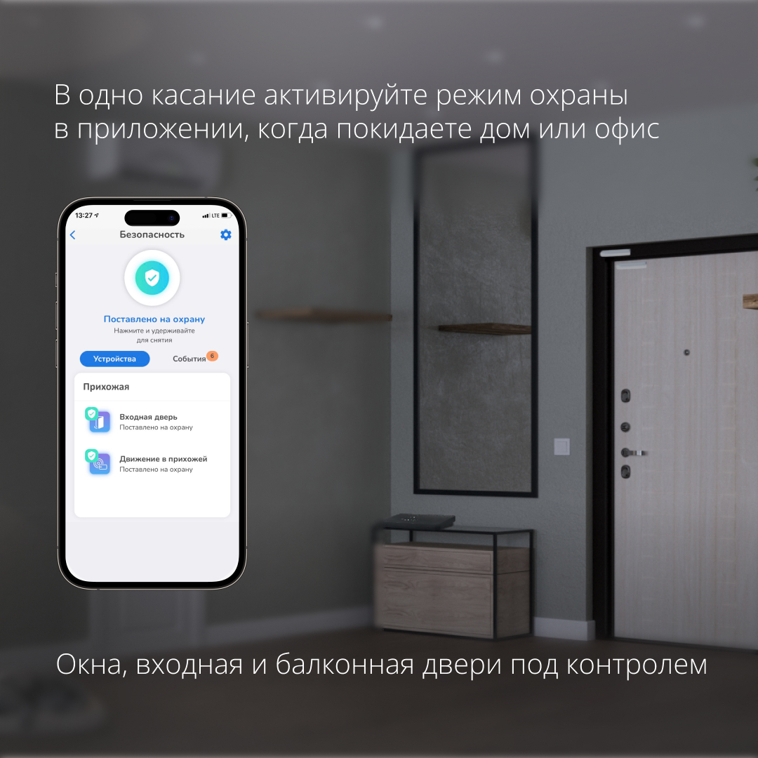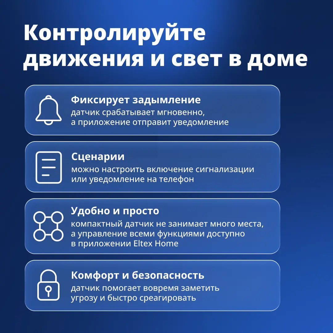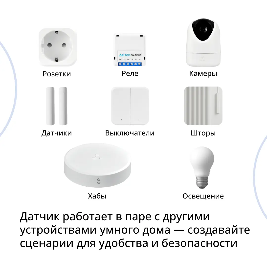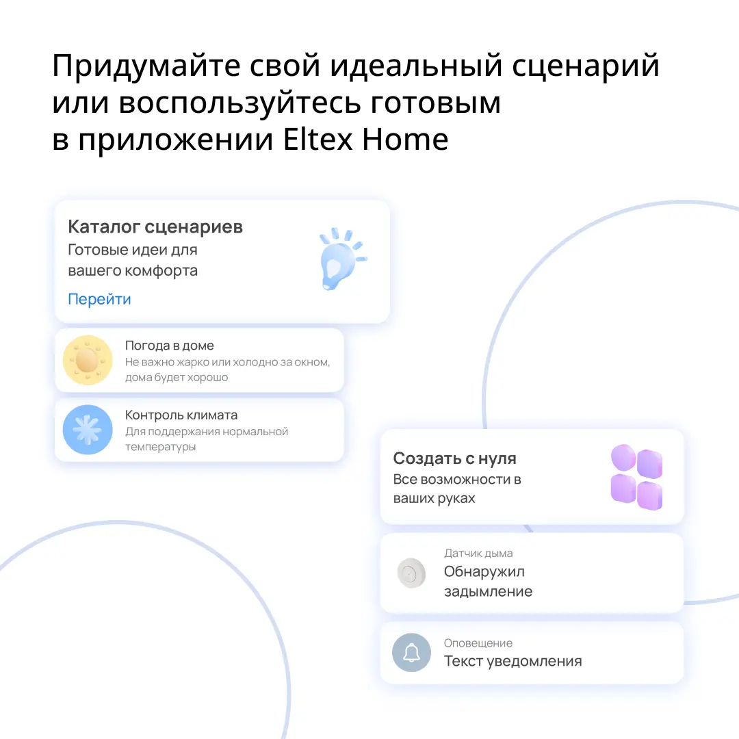 Создавайте сценарии с другими умными устройствами Eltex: освещение включится при открытии двери, климатические приборы отключатся при открытом окне, запись с камеры начнётся, когда кто-то войдёт.