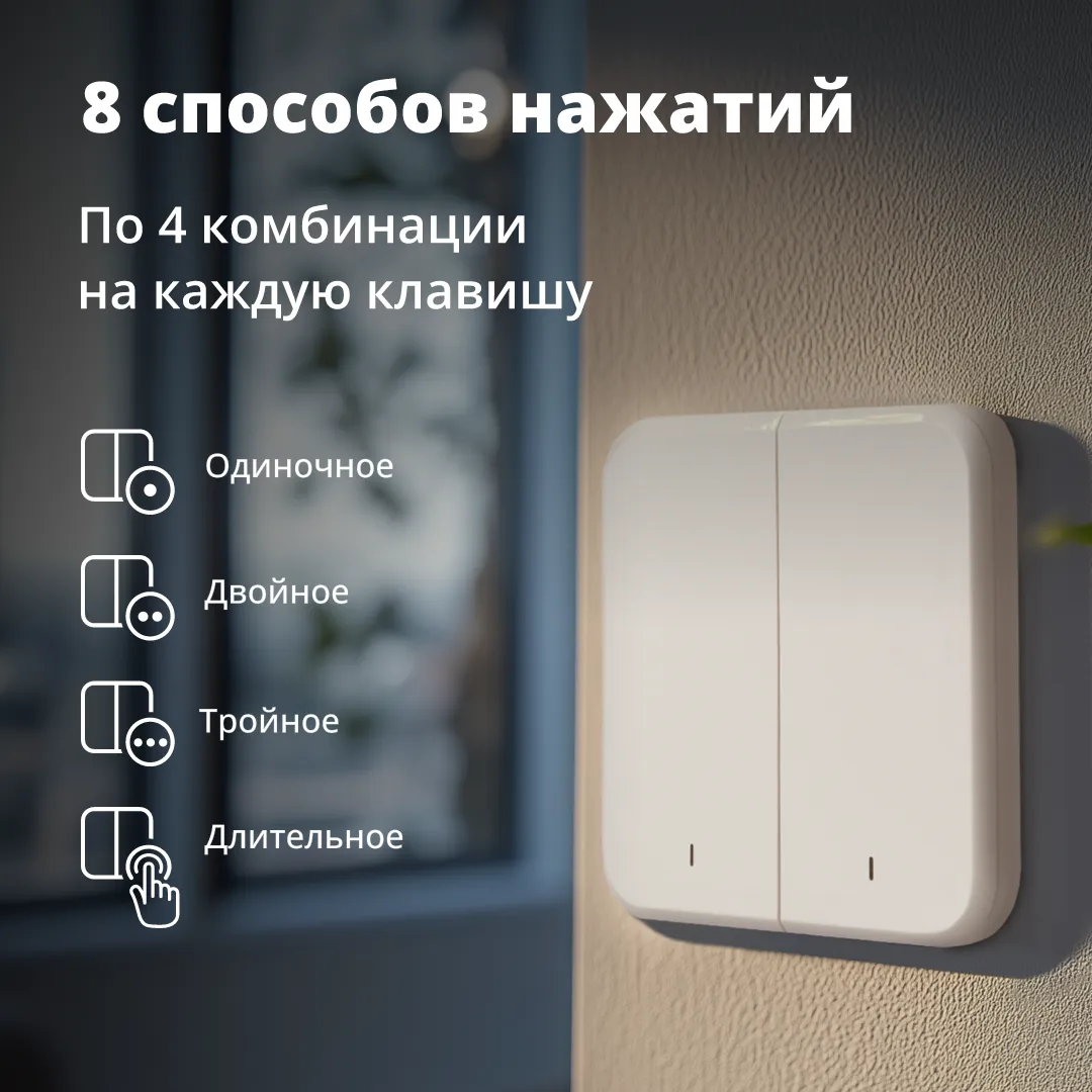 По четыре комбинации нажатий на каждую клавишу: одиночное, двойное, тройное и длительное. Например, одним нажатием можно выключить вентилятор, а долгим — погасить свет в коридоре. Назначайте команды на каждую клавишу, чтобы запускать заранее настроенные сценарии, режимы или управлять умными устройствами Eltex.