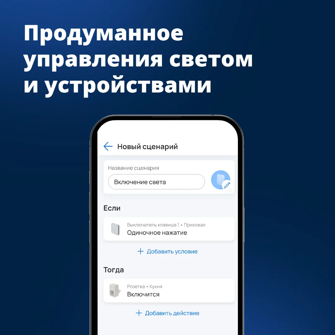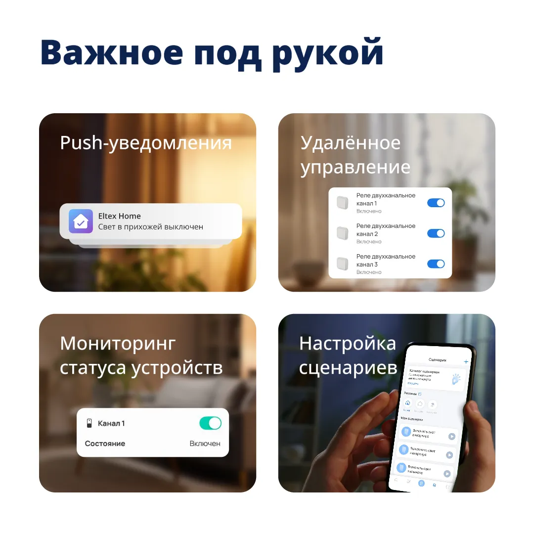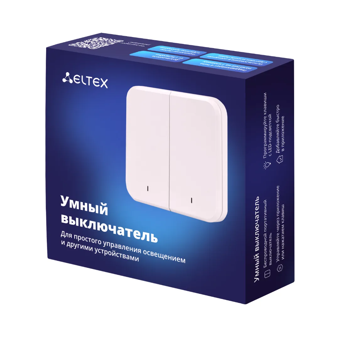 Умный двухклавишный выключатель — часть экосистемы умного дома Eltex. Создавайте сценарии совместной работы устройств, настраивайте расписание и следите за состоянием умного дома в приложении Eltex Home.