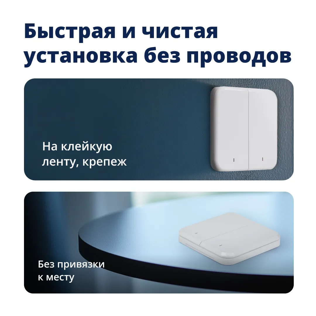 Беспроводной выключатель работает по технологии Z-Wave, поэтому для его подключения нужен хаб Eltex. Работает без проводов: выключатель питается от батарейки CR2450, поэтому его легко установить. Выбирайте комфортный способ монтажа: закрепите на стену, приклейте на любую поверхность с помощью монтажного скотча или используйте как переносной — перемещайте по дому, как вам удобно. Предусмотрели все варианты и добавили в комплект всё необходимое для установки.