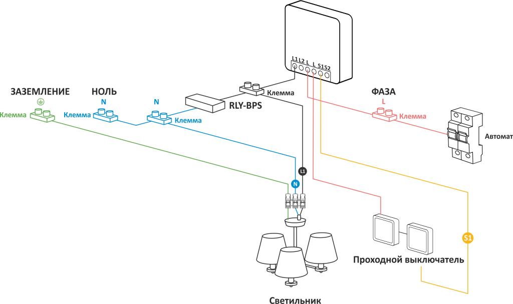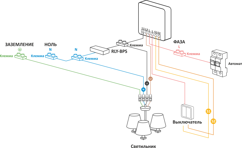 L, S1, S2 – для подключения однокнопочных и двухклавишных выключателей.