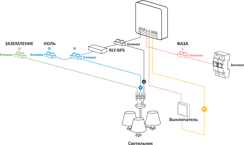 - RLY-BPS подключается только к нагрузке, управляемой каналом L1.